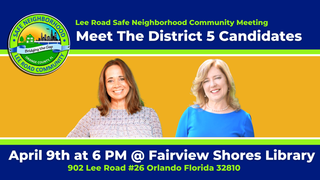Join the Lee Road Safe Neighborhood community for a meet and greet event with the Candidates of District 5. This event is April 9th at 6 pm at the Fairview Shores Library off Lee Road.