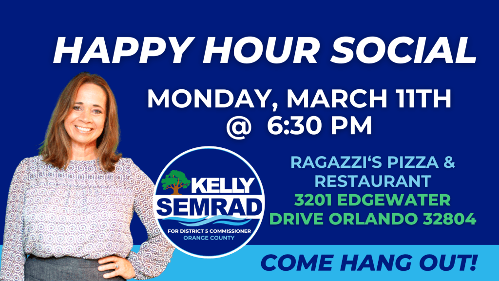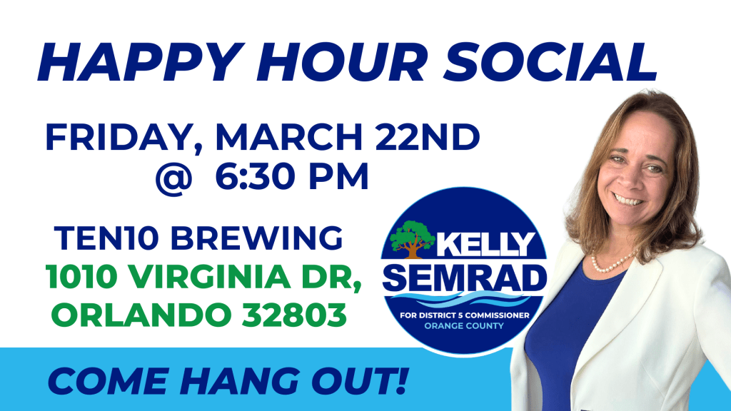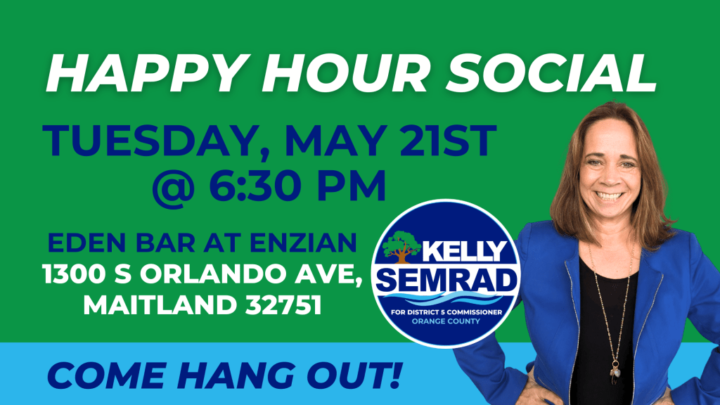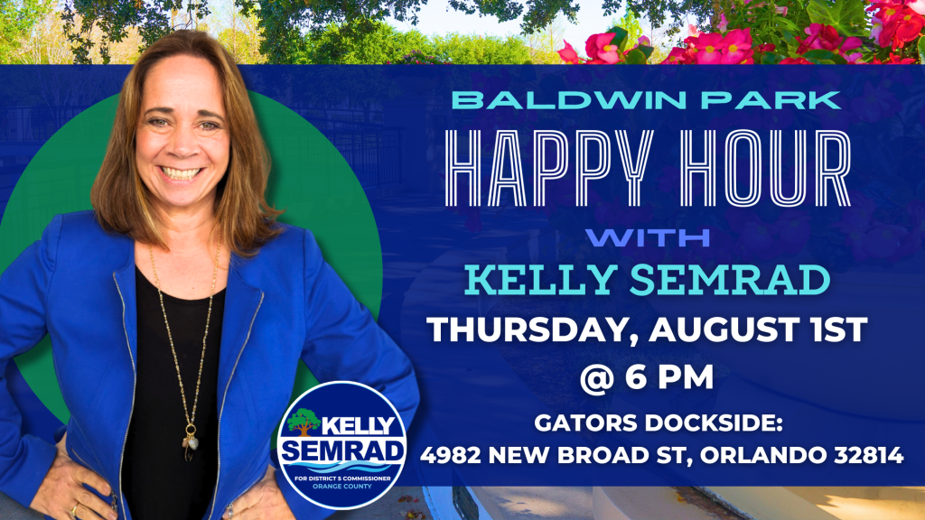 Join us for a relaxing and fun evening with Kelly Semrad, candidate for Orange County District 5 Commissioner! Come out to Baldwin Park and enjoy a happy hour while getting to know Kelly and learning more about her vision for our community.