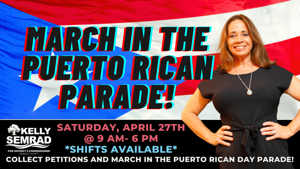 Join us in making history at the Puerto Rican Parade with Kelly Martinez Semrad for Orange County District 5 Commissioner! On Saturday, April 27th we’re asking volunteers to march alongside Kelly Martinez Semrad, a candidate committed to representing all voices in our community. But our involvement doesn’t stop there – we’ll be setting up tables to collect signatures for Kelly’s candidacy throughout the day.