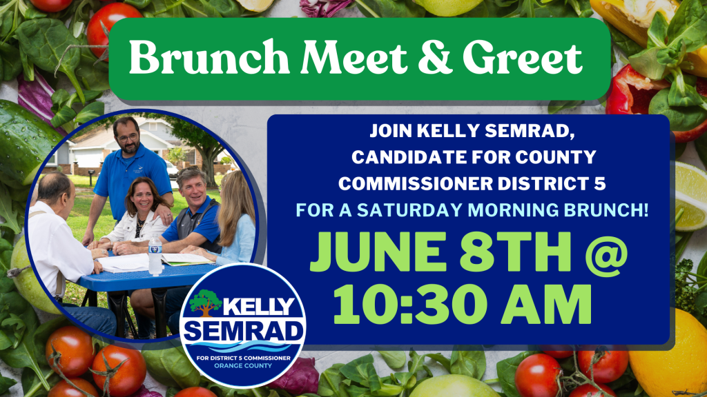Join us for a Farm to Table Meet and Greet Brunch with Kelly Semrad, candidate for Orange County District 5 County Commission, on Saturday, June 8th at 10:30 am in the College Park Area!