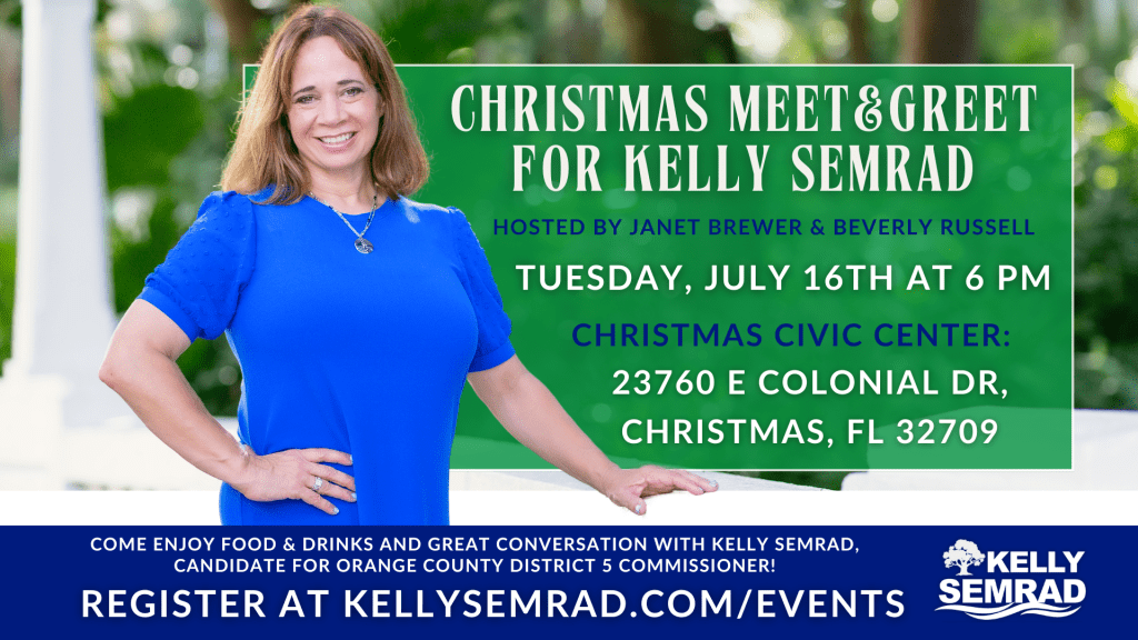 Meet Kelly Semrad in Christmas for a wonderful event to listen, learn and share your vision of the future of Orange County!