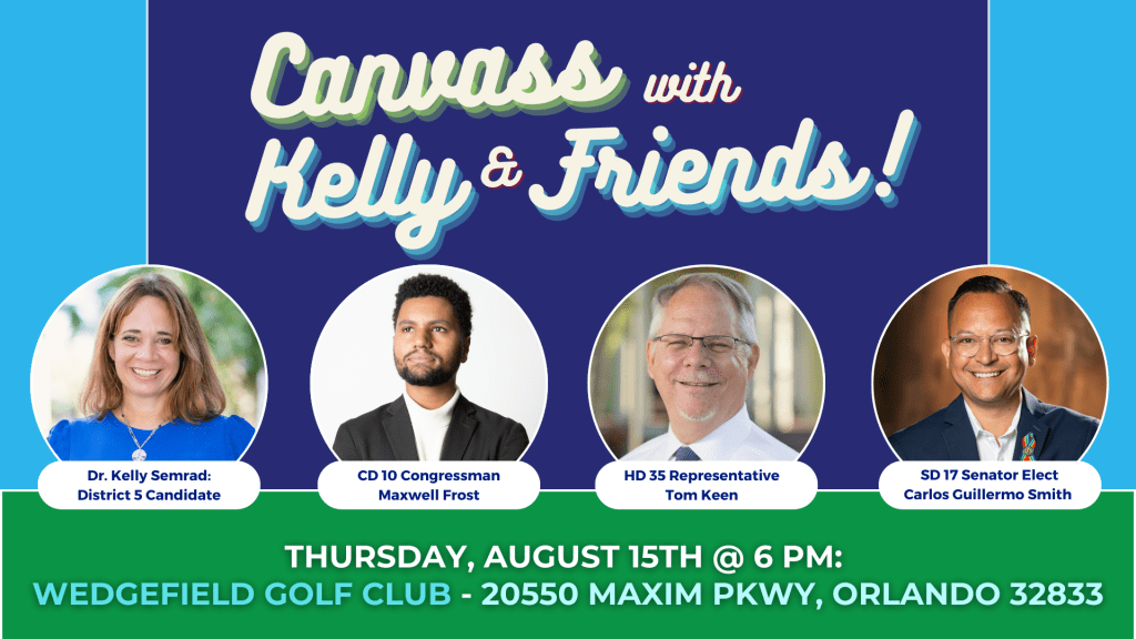 Join Kelly Semrad, candidate for Orange County District 5 Commissioner, along with Senator-Elect Carlos Guillermo Smith, Representative Tom Keen, and Congressman Maxwell Frost for an exciting grassroots canvassing events! Let’s knock on doors, engage with our community, and spread the word about the importance of this upcoming election.