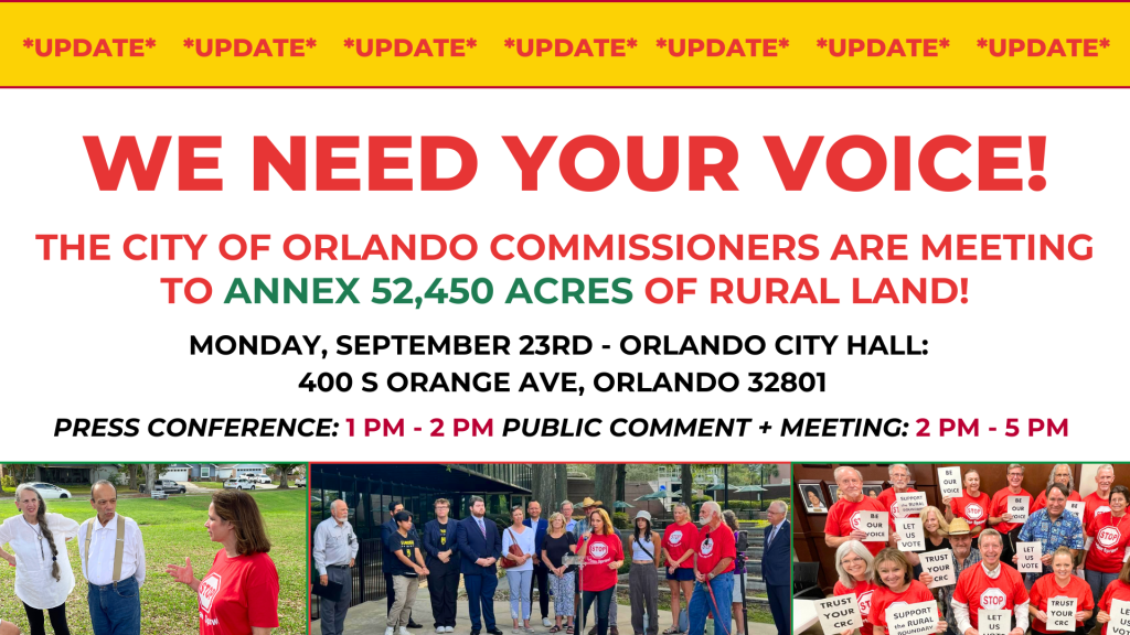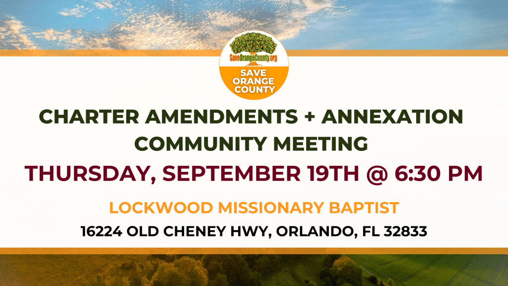 Save Orange County is hosting a crucial community meeting to discuss the new charter amendments we’ve fought for on the 2024 November ballot, including rural boundary and annexation protections. We will also address the urgent issue of the City of Orlando’s large 52,450 acre annexation proposal in rural East Orange County.
