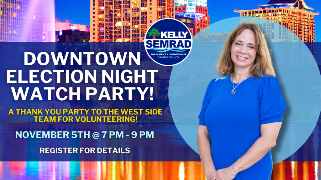 Join us for an exciting Election Night Watch Party hosted by Kelly Semrad, candidate for Orange County District 5 Commissioner! This special event will be held on the east side of Orange County.